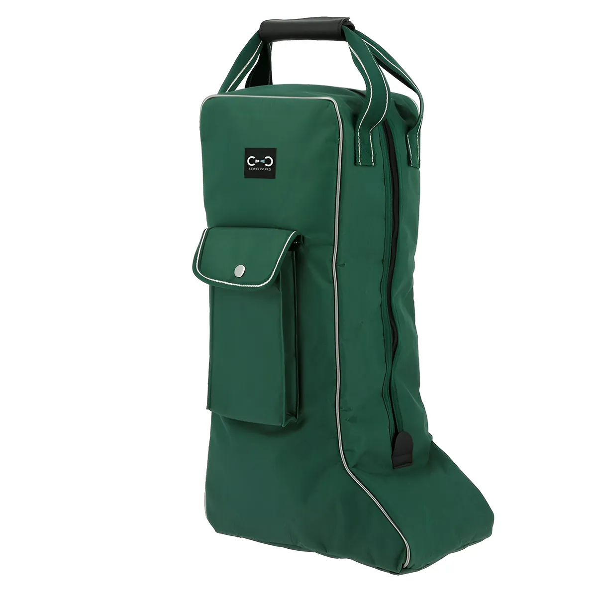 The Riding World Long Boots Bag offers practical protection for your tall riding boots, made from tough nylon to withstand everyday use. It features a zip closure, a press-stud side pocket for accessories, and sturdy carry handles. Plastic feet help keep the bag off wet ground.