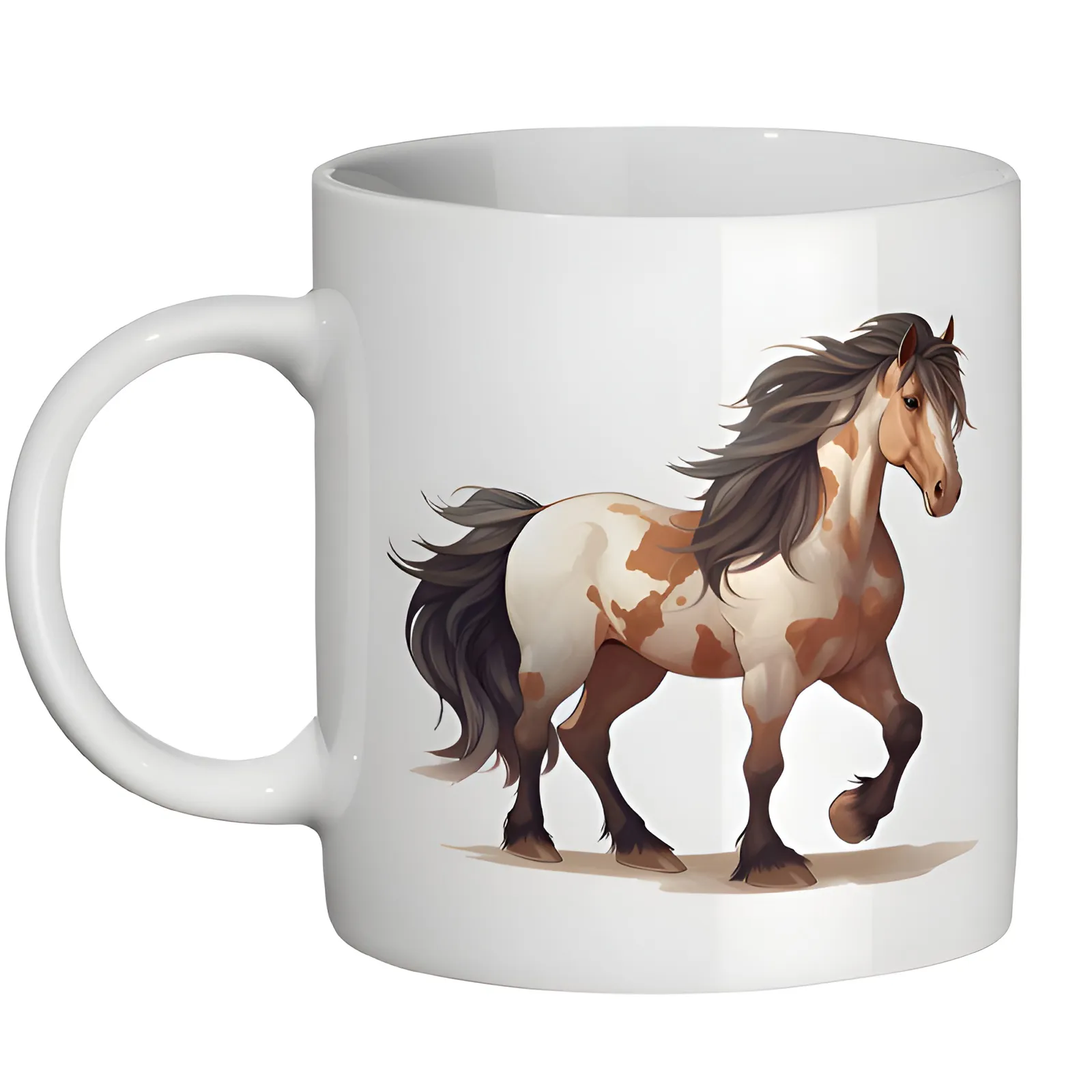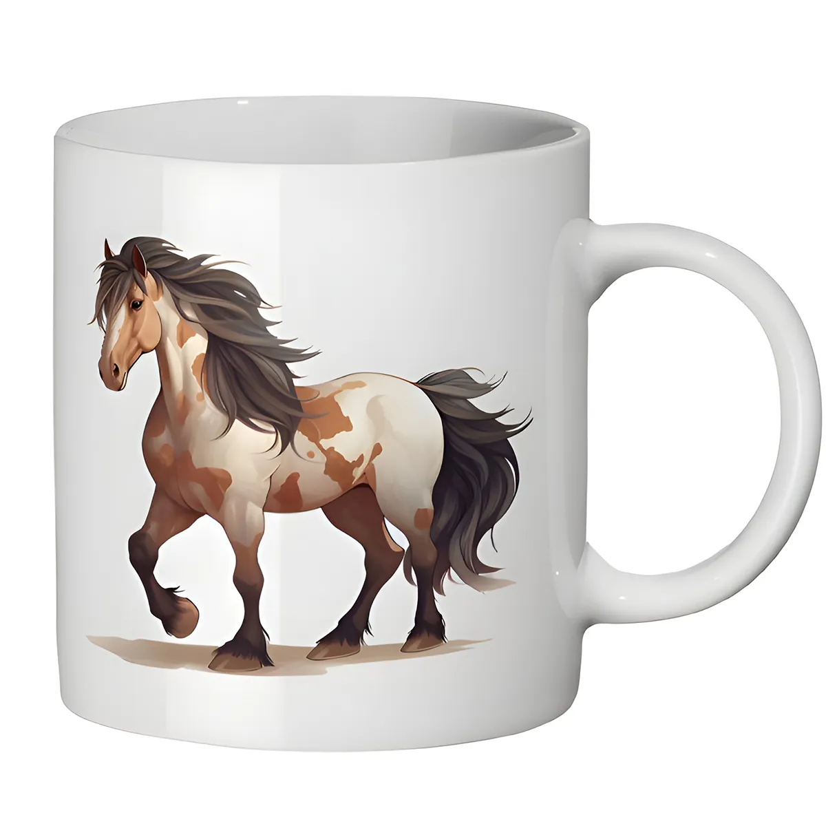 An 11 oz glossy white ceramic mug with a skewbald horse on both sides. This mug is perfect for any horse enthusiast’s hot or cold beverages. This ceramic mug is designed for convenience as it is dishwasher and microwave safe.