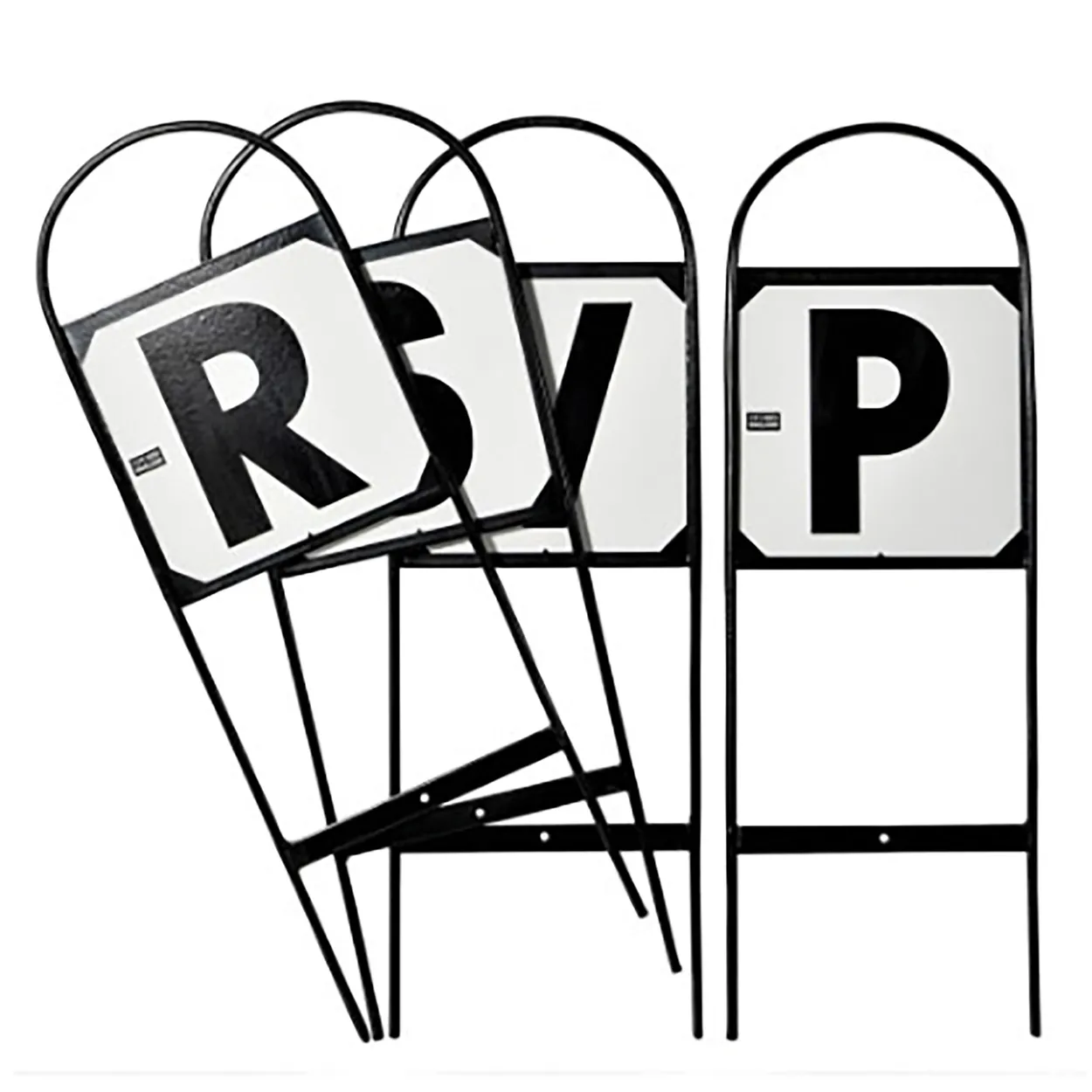 These dressage letters are mounted on a plastic coated steel frame for treading into the ground, with a hoop at the top for easy handling. Height above ground when inserted 1′ 10″.